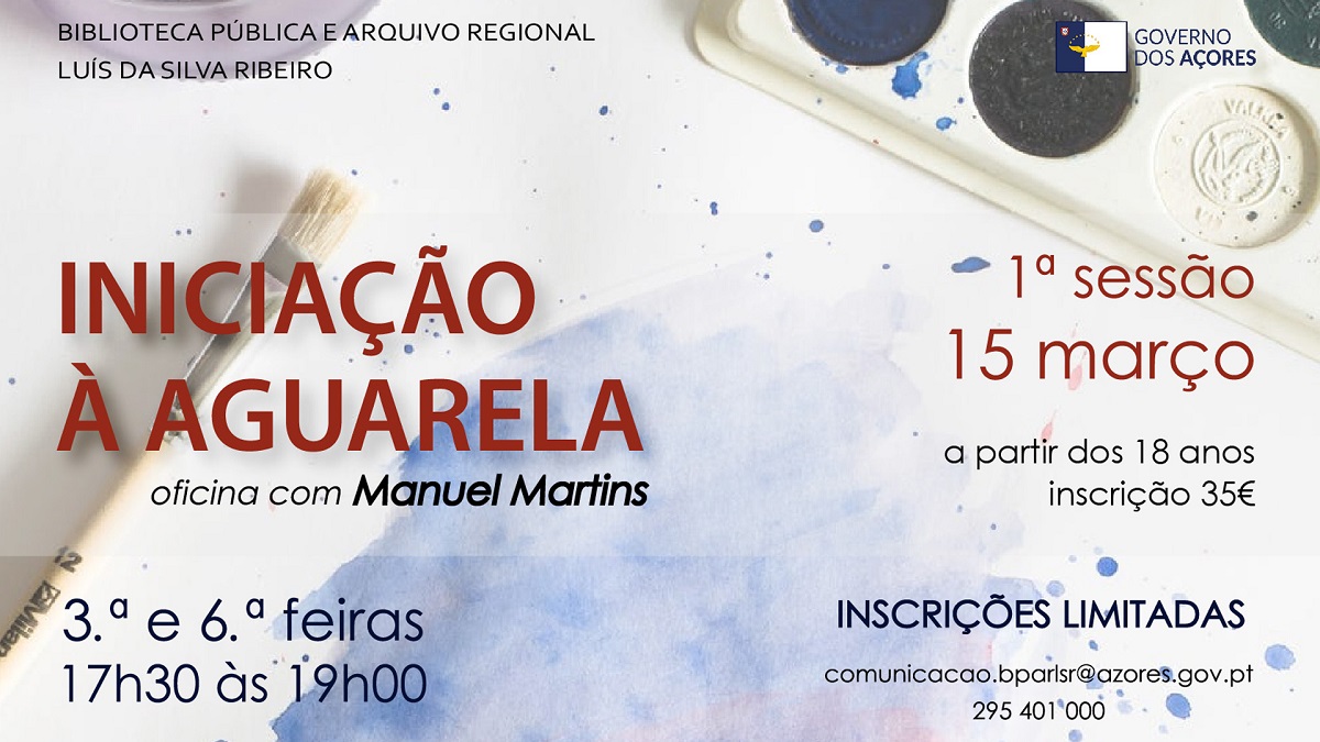 A Secretaria Regional da Cultura, da Ciência e Transição Digital, por via da Direção Regional da Cultura, através da Biblioteca de Angra do Heroísmo, promove, entre terça-feira e 7 de abril, às terças e sextas-feiras, das 17h30 às 19h00, a realização de uma Oficina de Iniciação à Aguarela, orientada por Manuel Martins.