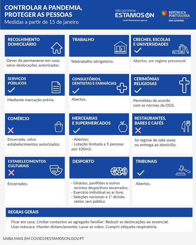 António Costa reiterou que as medidas de confinamento geral, que entram em vigor a partir das 00:00 de 15 de janeiro, sexta-feira, estão projetadas para vigorar um mês, mas adiantou que o Governo vai reavaliá-las dentro de 15 dias.