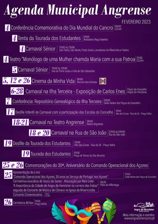 Calendário de destaques de fevereiro de 2023 em Angra do Heroísmo
