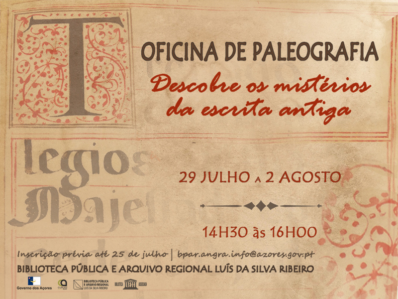 A Direção Regional da Cultura, através da Biblioteca Pública e Arquivo Regional Luís da Silva Ribeiro (BPARLSR), em Angra do Heroísmo, promove, entre os dias 29 de julho e 2 de agosto, a realização da oficina de paleografia, intitulada “Descobre os mistérios da escrita antiga”.
