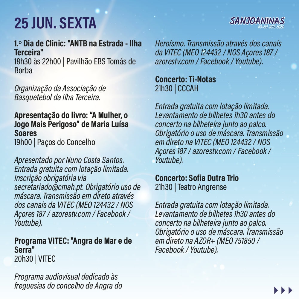 Consulte aqui abaixo o programa das Sanjoaninas 2021 para hoje, Sexta-feira, dia 25 Junho.